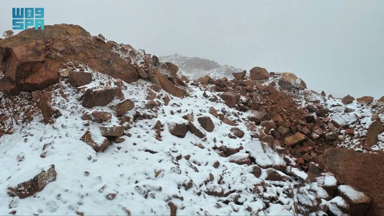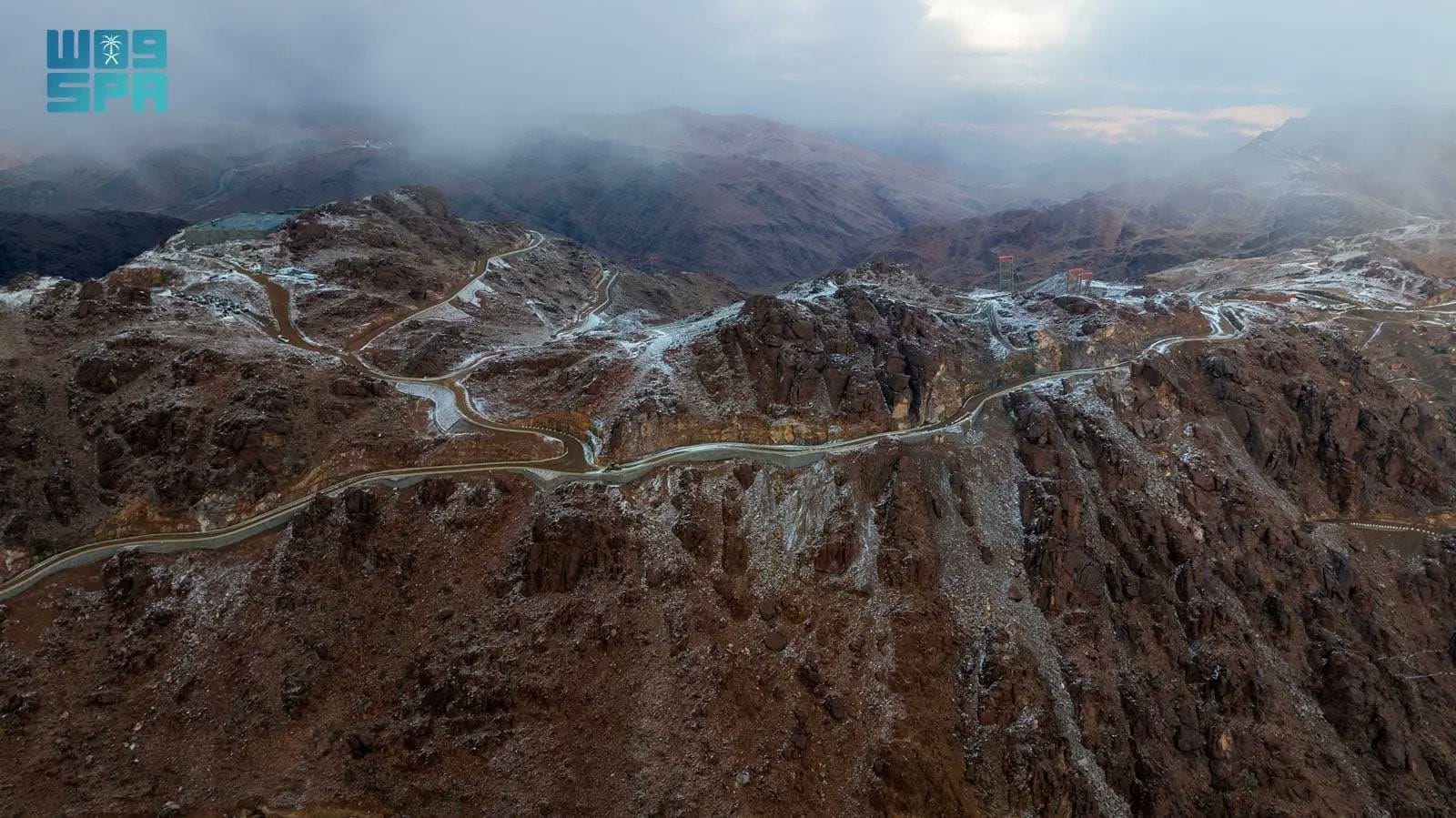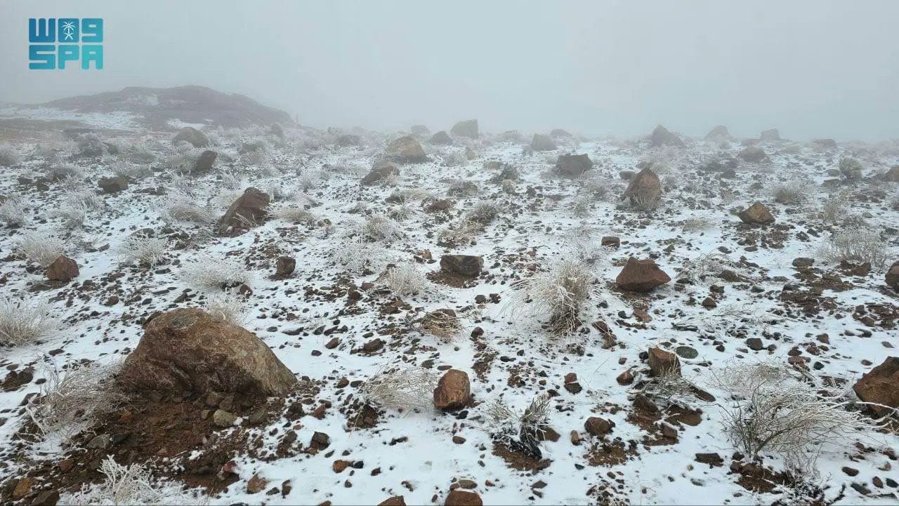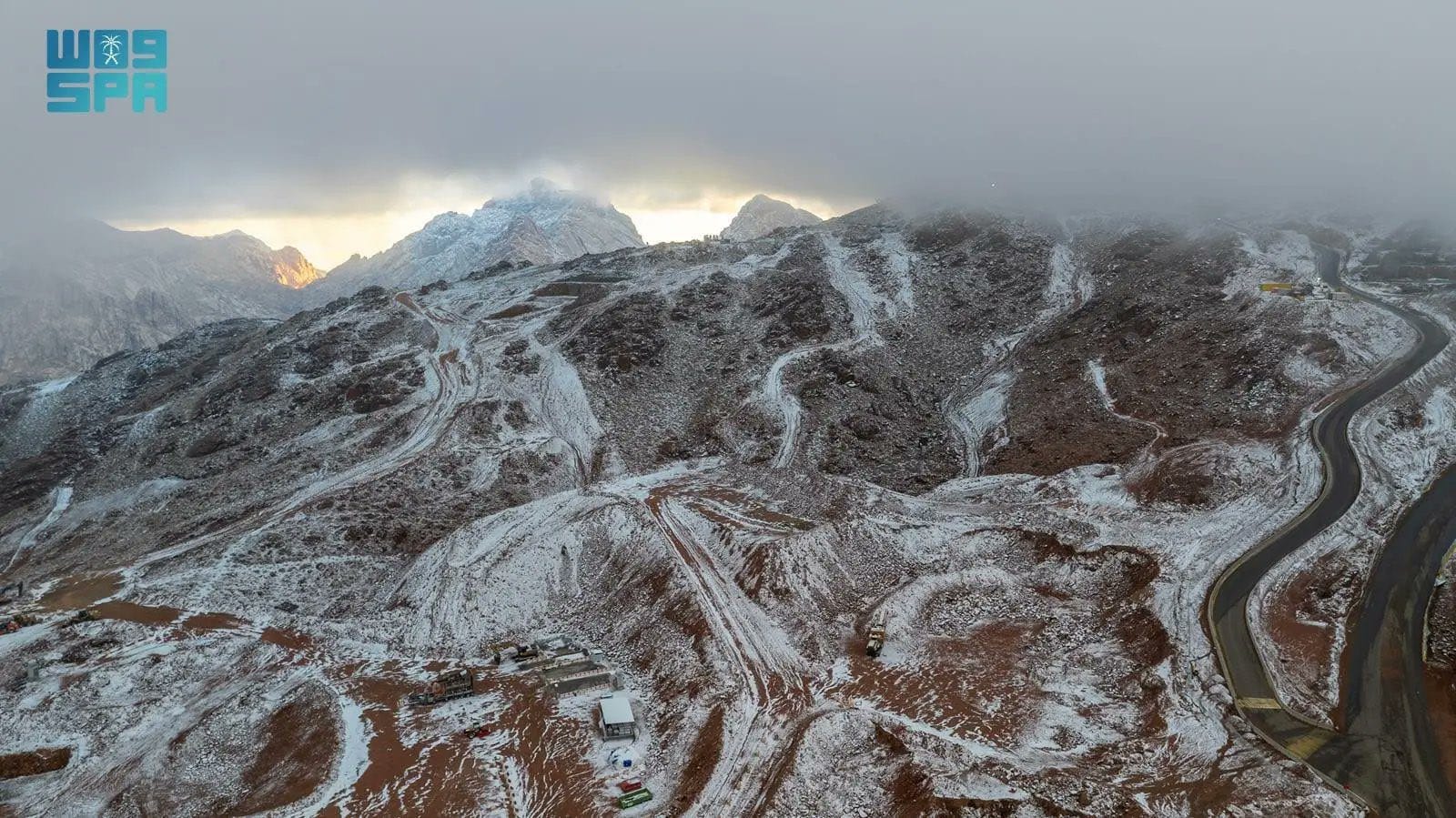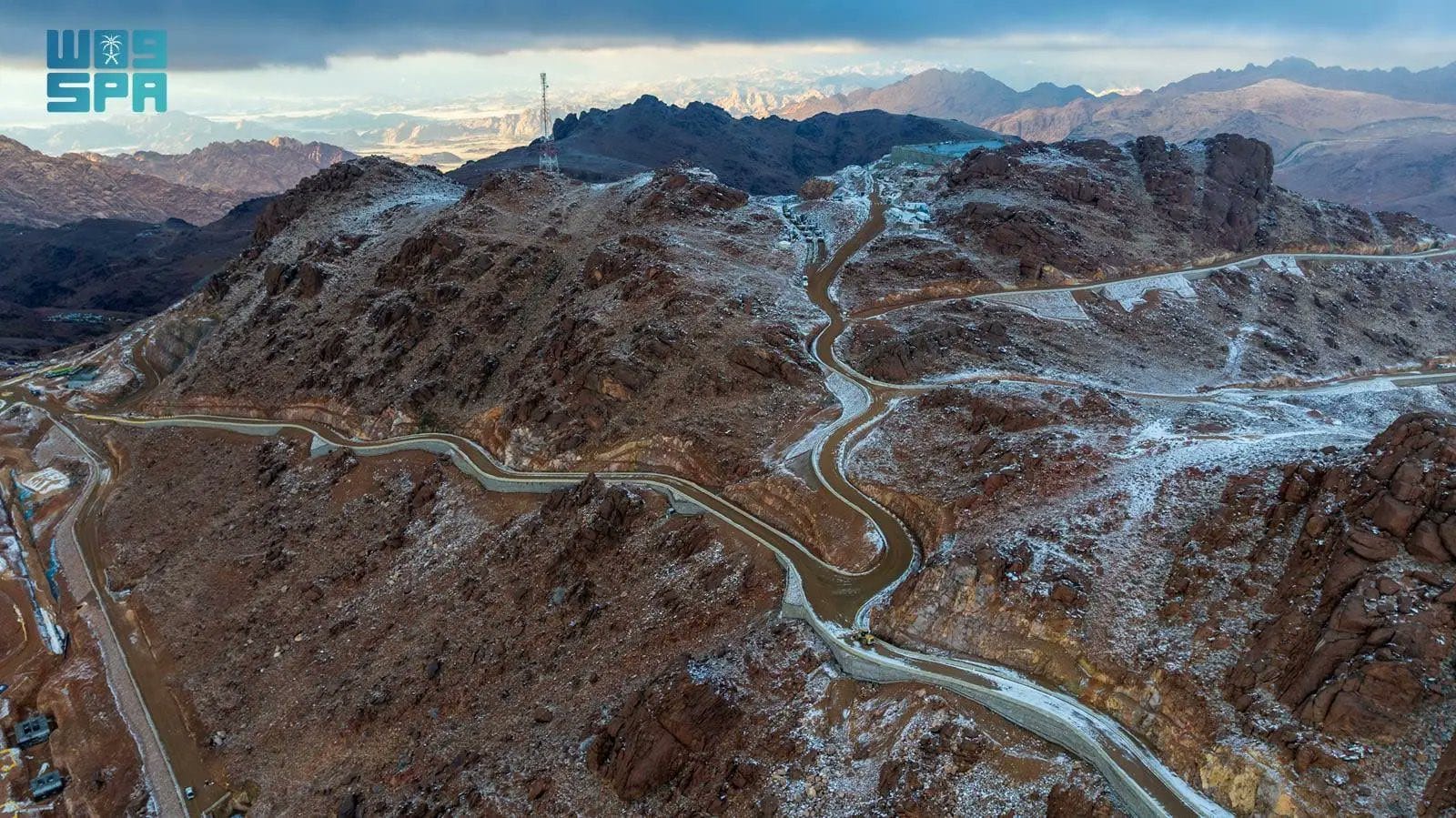 Massa de ar polar provoca neve em montanhas do norte da Arábia Saudita e transforma paisagem desértica em cenário de inverno.